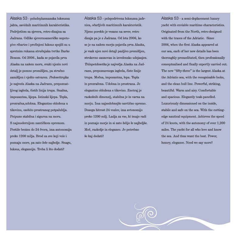 S ovom tvrtkom koja se bavi zastupstvom, proizvodnjom i prodajom motornih jahti uspješno surađujemo već pet godina. Uzajamnom podrškom i poticanjem na izradu proizvoda zapažene izvrsnosti predstavili smo puno dobrih projekata. Među njima su oglasi, katalozi, pozivnice, čestitke...